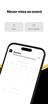 NEVER MISS AN EVENT The event section shows a list of events throughout the district. Users can add an event to your calendar to share the event with friends and family with one tap.