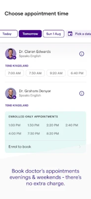 2. For booked appointments, choose the Tend doctor, date and time that’s right for you. If you’re seeing the next available GP, you’ll be shown your estimated waiting time.